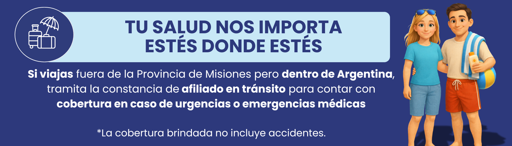 Si viajas fuera de la Provincia de MISIONES pero dentro de ARGENTINA, debes tramitar la constancia de AFILIADO EN TRÁNSITO para contar con cobertura en caso de emergencias o urgencias médicas. La cobertura brindada para estos casos no incluye accidentes.